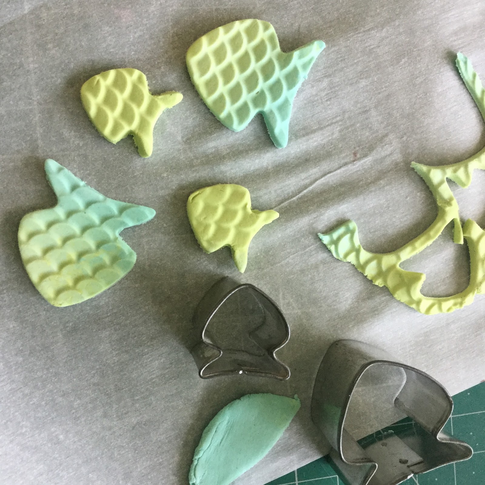 Place scale texture sheet onto blended clay sheet with pattern so scales will be extending from clay. Gently rub texture sheet with clay roller to transfer texture.